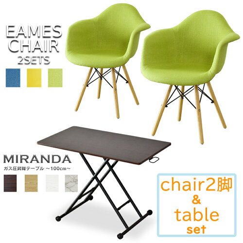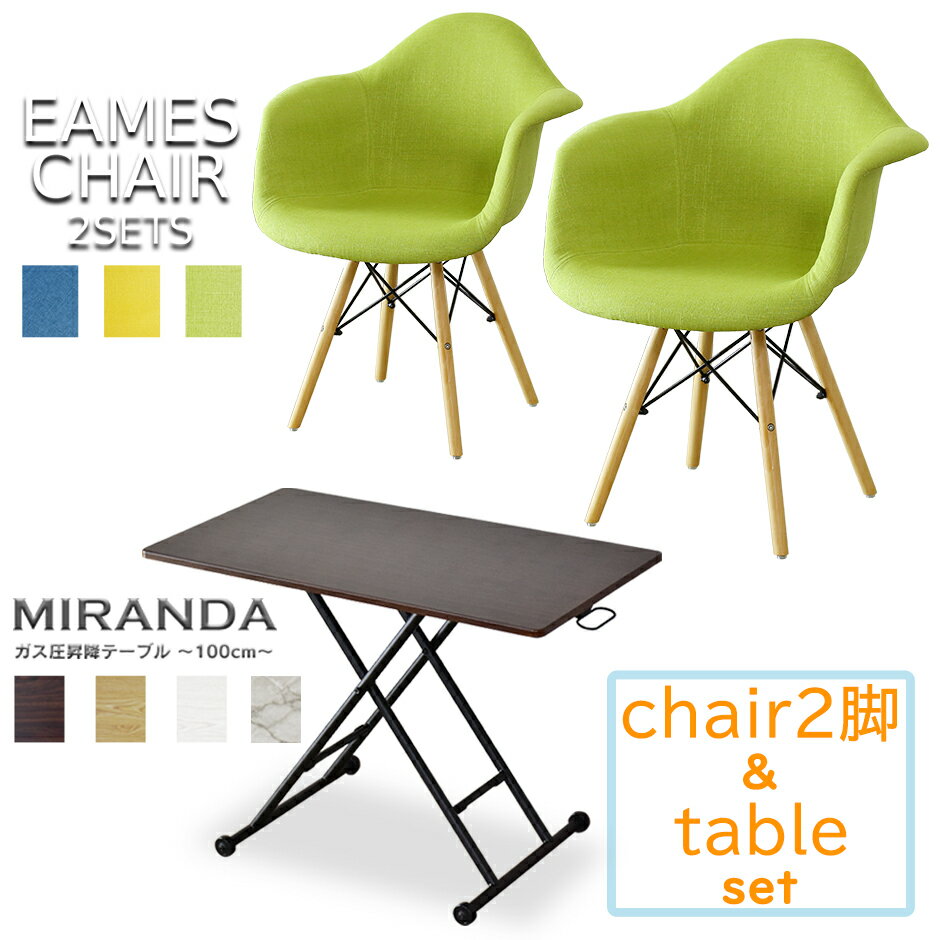 【4/29限定 クーポン10%オフ】ダイニングチェア 昇降テーブル チェア テーブル セット 2脚 北欧 デザイナーズ 昇降式 無段階 高さ調節 ダイニング デスク イームズDAW肘付き ミランダ100cm 母の日